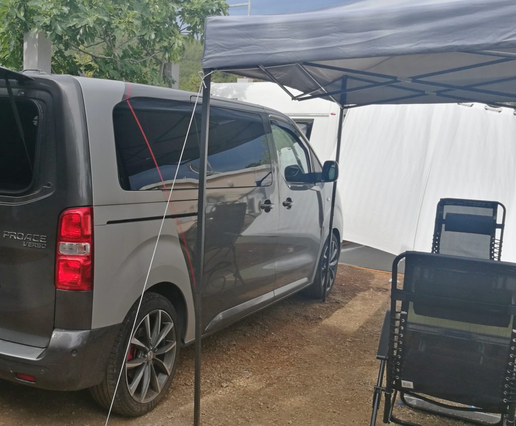 Nůžkový, rozkládací přístřešek tzv.“Poutníkova  terasa„- samostojný, nezávislý na  autě, v šedé barvě interiéru, 3x3m, boční stěny, nosnost konstrukce min. 100kg. Osvědčený doplněk při kempování, stejně jako zdroj stínu nebo „hlídač“ místa v kempu po dobu vašeho odjezdu např. na večeři.